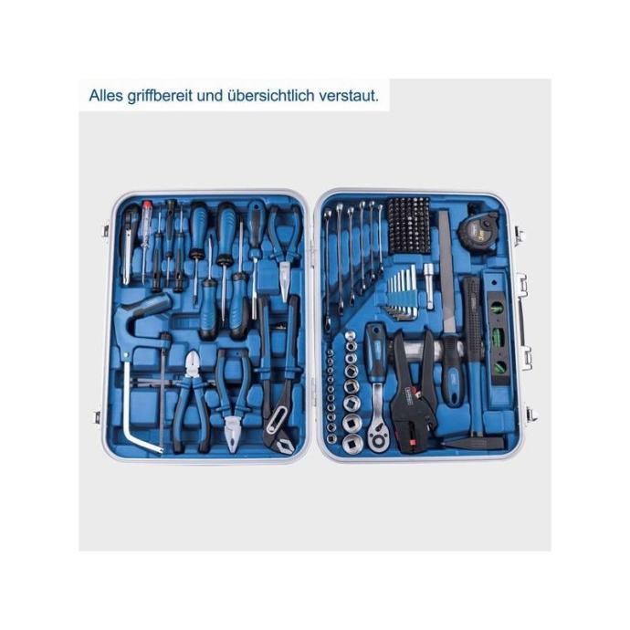 alati su izrađeni od visokokvalitetnog, izdržljivog krom-vanadij čelikapraktičan i sveobuhvatan set alata od 174 dijela alati izrađeni od visokokvalitetnog krom-vanadij čelikajednostavan transport i praktično spremanje alata u robusnoj i zaključanoj ABS plastičnoj kutiji s ojačanim kutovimadobro organizirani i pregledno raspoređeni alatikompaktna i lagana kutija za alat – samo 6,3 kg, pogodna i za mobilnu upotrebuUključuje:7 x 3/8" šesterokutni nastavci 12–24 mm1 x 3/8" preklopna račva1 x 3" produžetak1 x 3/8" na 1/4" adapter za nastavke10 x 1/4" šesterokutni nastavci 4–11 mm1 x 1/4" držač bitova6 x kombinirani ključevi 8–17 mm7-dijelni set šesterokutnih ključeva (1,5, 2, 2,25, 3, 4, 5, 6)30x kabelske vezice 2,5 x 100 mm1x mjerna traka1x radionička turpija1x precizna libela1x čekić77x umeci za bitove 25 mm1x skidač izolacije1x kliješta za vodenu pumpu1x bočni rezači1x kombinirana kliješta1x kliješta s ravnim vrhom1x višenamjenski nož10x rezervne oštrice višenamjenskog noža1x pila za metal3x rezervne oštrice pile za pilu za metal1x ispitivač napona 120–250 V~3x precizni odvijači PH0, PH00, SL34x odvijači PZ1x75 mm, PZ2x100 mm, SL5.5x75 mm, SL6.5x100 mm1x torba za nošenje i ključ]]>