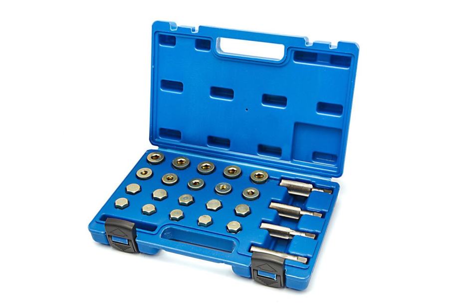 ovaj izvrstan komplet za popravak navoja sadrži 4 ureznice, 20 čepova za ispuštanje ulja i 40 bakrenih brtvenih prstenapogodno za popravak navoja korita, mjenjača i diferencijalakomplet uključuje duge navoje i zamjenske čepove za ispuštanje ulja za zamjenu trenutno oštećenih ili istrošenih navojapogodan je za većinu niti koje se koriste u automobilima i kombi vozilima, uključujući marke kao što su Audi, VW, BMW, Citroen, Fiat, Ford, Seat, Honda, Mazda, Mitsubishi, Opel, Peugeot, Renault, Toyota i Volvo4 x ureznice od HSS -a (brzi čelik) HSS 4341 - M 13 x 1,5 | M 15 x 1,5 | M 17 x 1,5 | M 20 x 1,5 (4 veličine, 1 komad po veličini)20 x čepovi za ispuštanje ulja izrađeni od 45CR (4 veličine, 5 komada po veličini)40 x aluminijski brtveni prstenovi (4 veličine, 10 komada po veličini)visoka kvaliteta osigurava dugogodišnju uporabuisporučuje se u prijenosnoj kutiji]]>