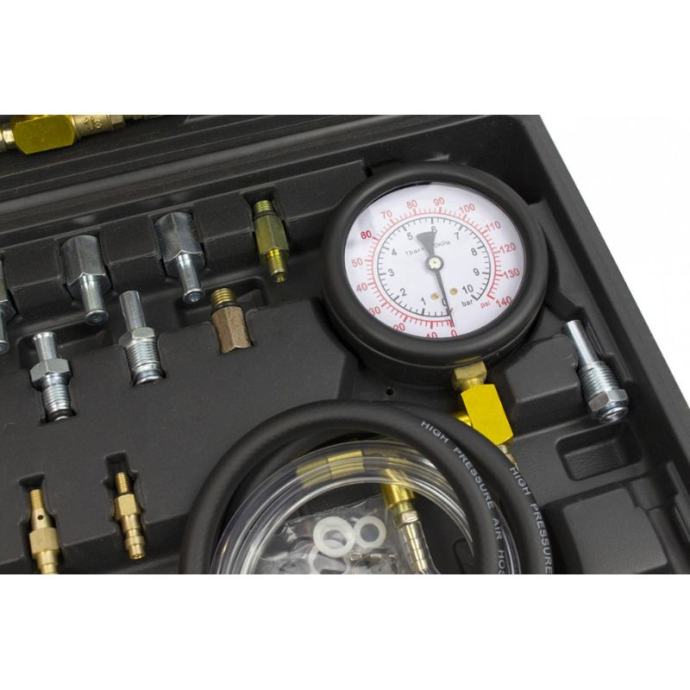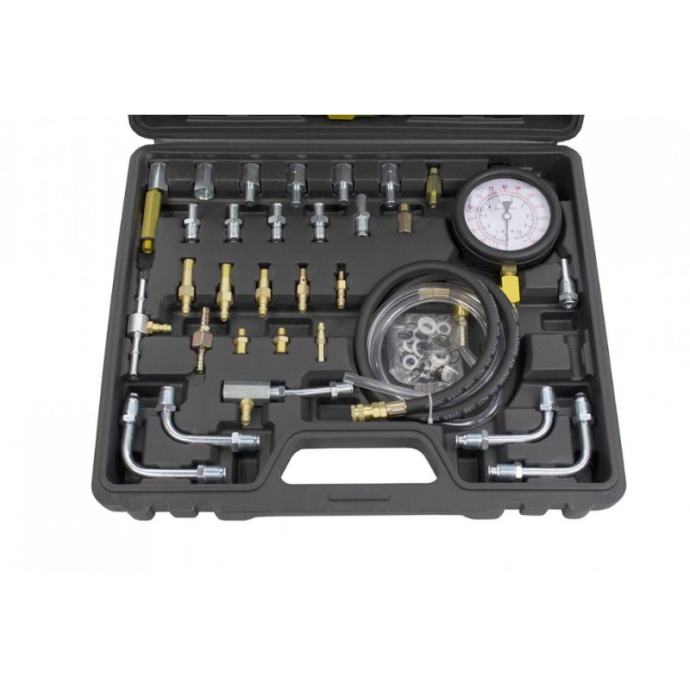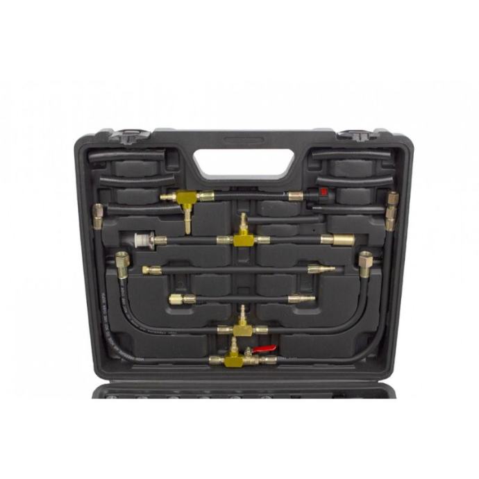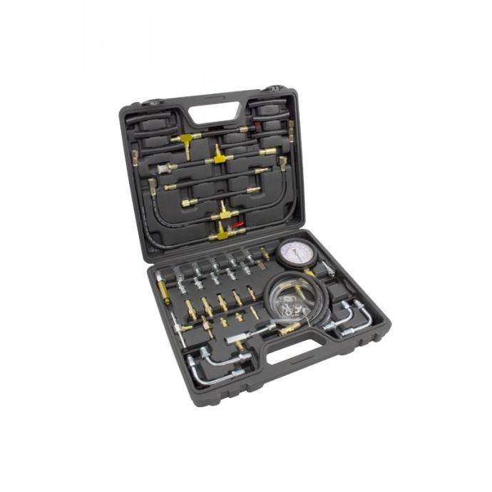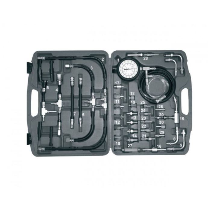 Sveobuhvatan komplet crijeva, adaptera i priključaka za ispitivanje tlaka na modernim sustavima ubrizgavanja benzinskog gorivaopremljen brzim spojkama i sigurnosnim ventilom za sprječavanje nenamjernog ispuštanja goriva pod pritiskomisporučuje se s jednim manometrom visokog tlaka s gumenim odbojnikom, očitavanjem 0-140 psi i 0-10 baraventil za otpuštanje tlaka opremljen dugim odvodnim crijevom omogućuje siguran povrat goriva1 (1x)Mjerač 3-1/2” sa sklopom adaptera za crijevo 140 psi2 (1x)Spojno crijevo i sklop ventila za Bosch CIS3 (1x)Spojno crijevo za GM TBI4 (1x)Adapter Ford EFI5 (1x)Adapter Ford EFI6 (1x)Brzo povezivanje s adapterom mali Schrader za Ford aplikacije7 (1x)Brzo spajanje na standardni adapter Schrader8 (2x)adaptera ø10 mm cijevi s muškim 5/8" - 18 UNF priključcima9 (2x)adapter ø10 mm cijevi s muškim 5/8"-18 na M16x1.5 s 'o' prstenastim priključcima10 (2x)adapter ženski M16 x 1,5 na ženski 5/8"-18unf11 (2x)ženski adapter M14 x 1,5 na cijevni priključak ø3/8".12 (2x)ženski adapter M16 x 1,5 na cijevni priključak ø3/8".13 (2x)muški adapter M14 x 1,5 s 'O' prstenom na cijevni priključak ø3/8".14 (2x)muški adapter M16 x 1,5 s 'O' prstenom na cijevni priključak ø10 mm15 (1x)Adapter za Isuzu (lanzul-tec sustavi)16 (1x)Brzo spojni razdjelnik s ø1/14"- 5/16" cijevnim priključcima17 (1x)Adapter muški M12 x 1.5 na muški M10 x 1.0 sa 'O' prstenom za Mercedes Benz18 (1x)Adapter muški M12 x 1.5 na ženski M10 x 1.0 za Ford/Volkswagen 16Vaplikacije19 (1x)Adapter muški M12 x 1,5 na ženski M8 x 1,0 Za BMW aplikacije20 (2x)adapter muški M12 x 1.5 na muški M8 x 1.0 sa 'O' prstenom za Mercedes Benz,VW GOLF & BMW aplikacije21 (1x)Adapter za brzo spajanje na M12 x 1,25 Banjo fiting s najlotronom22 (1x)Adapter za brzo spajanje na M12 x 1,5 Banjo spoj s mesinganim podloškama23 (1x)Adapter za brzo spajanje na M10 x 1,0 Banjo spojnice za triumph primjene24 (1x)Adapter za brzo spajanje na M8 x 1,0 Banjo priključak s mesinganim podloškama za Toyotuaplikacije25 (1x)Adapter za brzo spajanje na muški M6 x 1,0 s 'O' prstenom za Suzuki aplikacije26 (1x)Adapter za brzo spajanje na 1/4" cijev za Bosch mono Jetronic aplikacije27 (1x)Adapter muški M12 x 1,5 na muški M8 x 1,0 s 'O' prstenom za Audi sekundaraplikacije adaptera28 (2x)M14 x 1,5 muški adapter29 (1x)M14 x 1,5 muški adapter30 (1x)M14 x 1,5 ženski adapter]]>
