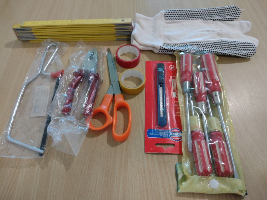 Prodajem višedjelni set alata: kliješta, skare, pila, odvijači, metar, rukavice…