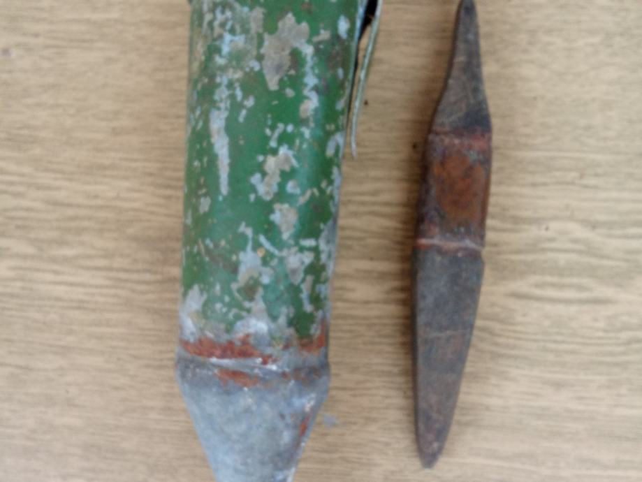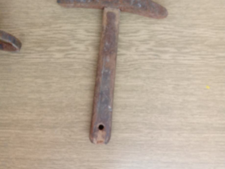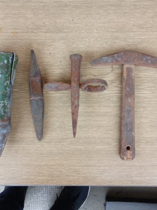 Stari alat za klepanje kose za košnju trave, plus todolac za brus, plus stari brus.
