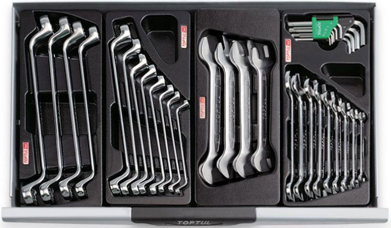 Set uključuje širok raspon alata, poput dvostrukih prstenastih ključeva s 75° nagibom, kombiniranih ključeva Super-Torque s 15° nagibom, nasadnih ključeva (1/4", 1/2"), bit nasadnih ključeva (šesterokutni, zvjezdasti, Pozi, Phillips), imbus ključeva, odvijača s ravnim i križnim vrhom, čekića, probijača, dlijeta, turpija, podesivih ključeva, kliješta i mnogih drugih dodataka. Ovo je savršen izbor za profesionalce koji traže kvalitetu, pouzdanost i organizaciju u svom radnom prostoru. 1. ladica: setovi alata GAAT0402, GAAT0802, GAAT0406, GAAT1802