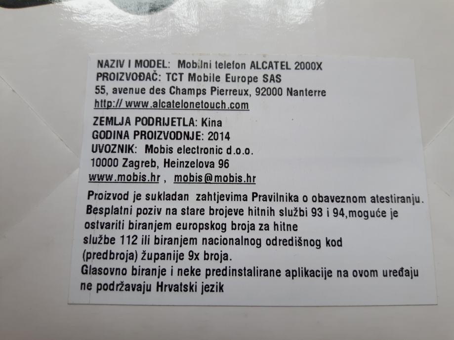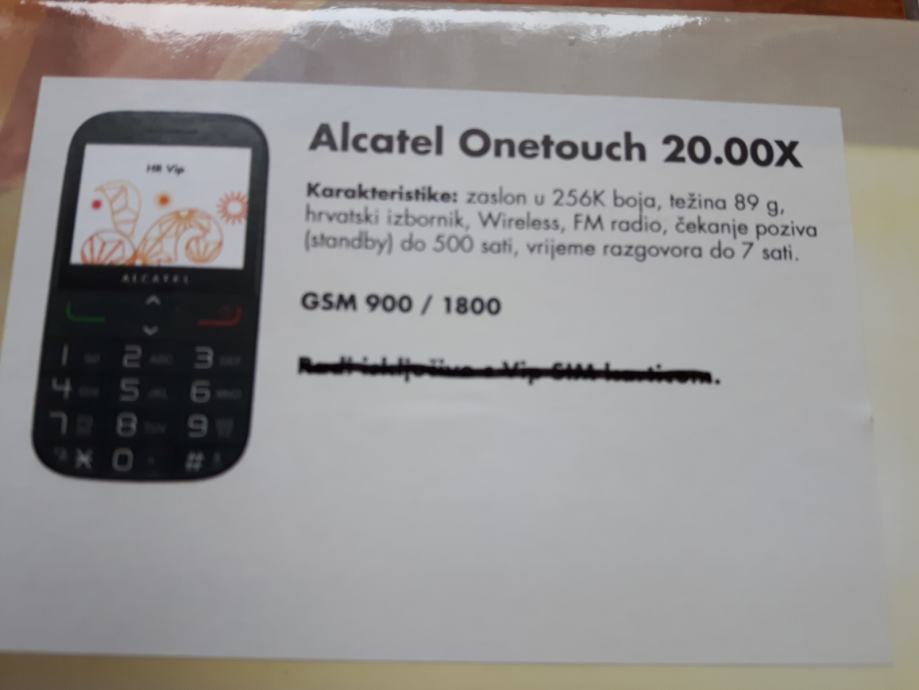 Klasični mobilni telefon Alcatel OT 2000 X idealan za osobe starije životne dobi. Vrlo jednostavan za rukovanje sa eksta velikim tipkama. Kod biranja broja emitira glasovni izgovor biranog broja na hrvatskom jeziku. Hrvatski menu. Vrijeme razgovora do 7 sati. Vrijeme čekanja do 500 sati. Dimenzije 112x61,5x12,8 mm. Težina 89 gr. Memorija 0,2 MB. Zaslon 2.4". Mobitel posjeduje FM radio i kalkulator i baterijsku lampu te praktičnu torbicu. Mobitel ima jamstvo do 30.11.2016. Mobitel šaljem kupcu pozećem putem Hrvatske pošte. U cijenu su uračunati troškovi dostave.