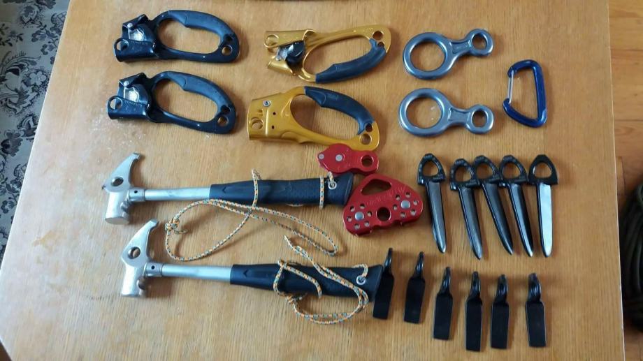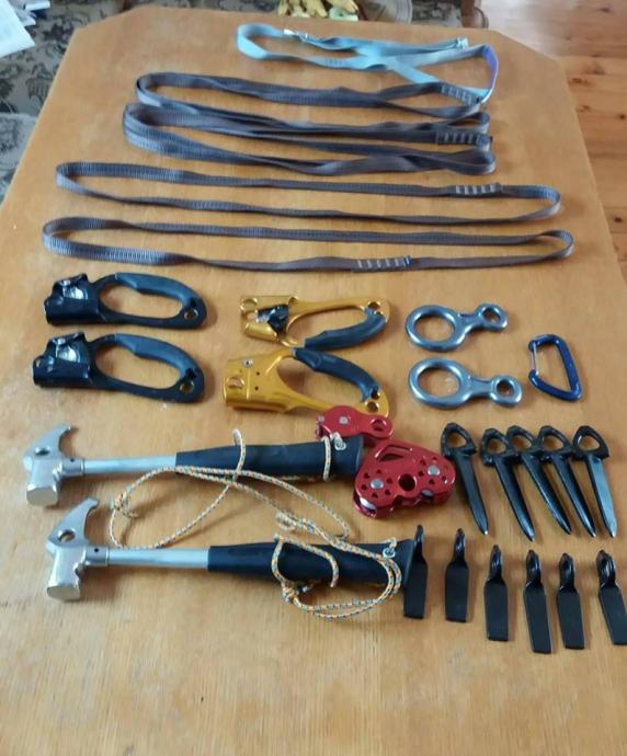 Moguće dostaviti do Dugog Sela. Cijene zasebno- klin duži 50 kn, klin kraći 30 kn,kladivo 200kn,penjalica 200kn,osmica 40 kn,kolutura 250kn.
