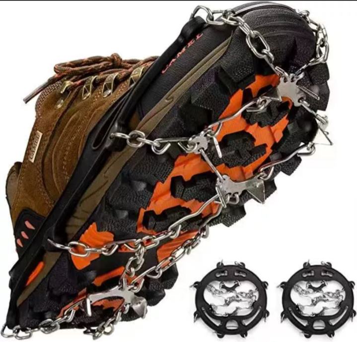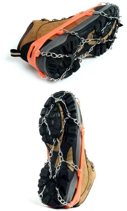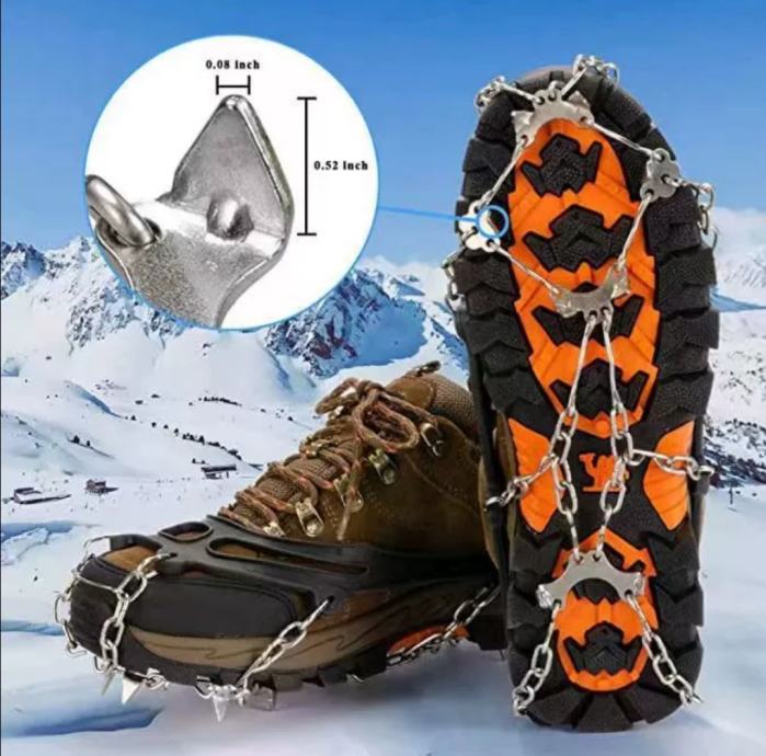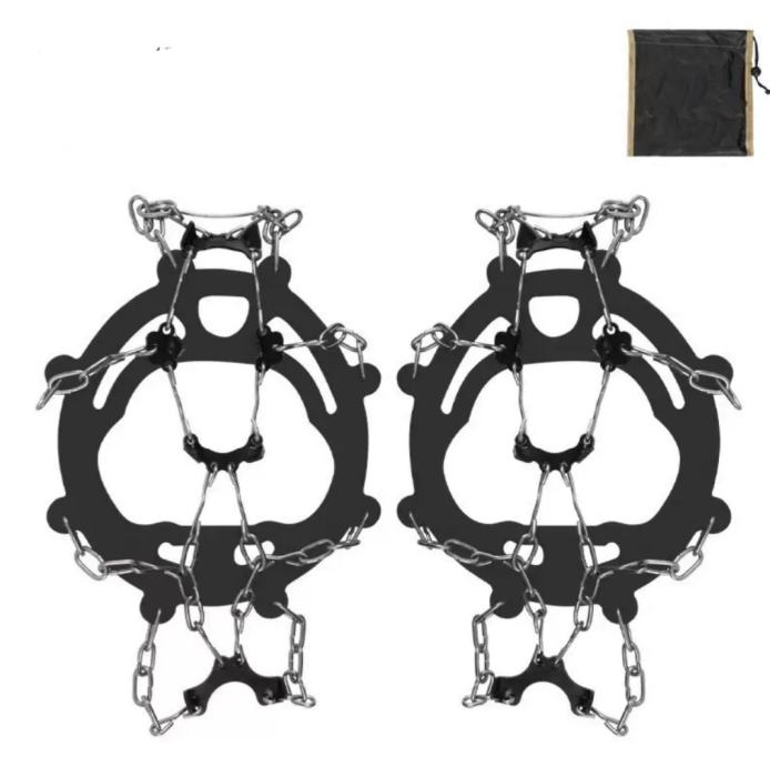 Na potplatu ove dereze imaju poseban pleteni lanac od kvalitetnog nehrđajućeg čelika sa toplinski obrađenim čeličnim zubima koji omogućuju učinkovito prianjanje. Jednostavno ih montirajte na obuću i pričvrstite pomoću trake. Pohranite ih u priručnu torbicu sa mogućnošću pričvršćvanja na pojas.