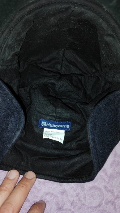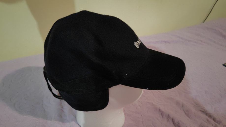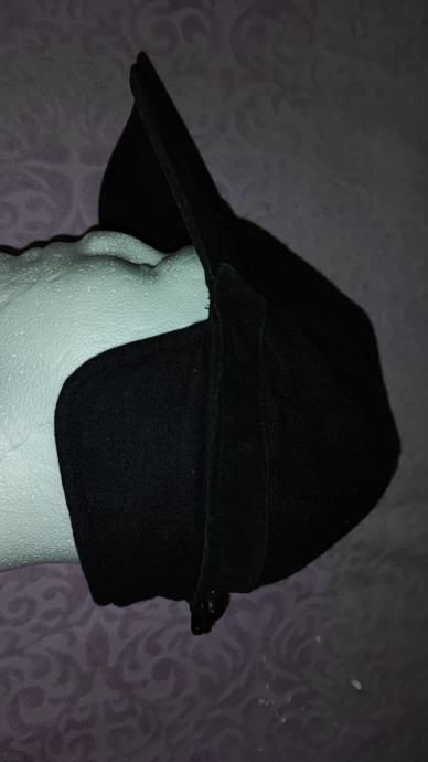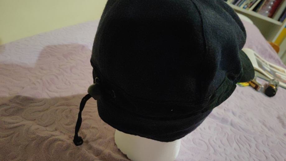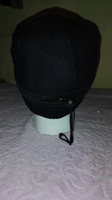 Podesiva po širina. Materijal vuna, viskoza i suedei koža na šiltu. Zaštita uha se da preklopiti. Dosta topla. Boja crna/ tamno plava. Univerzalna velicina