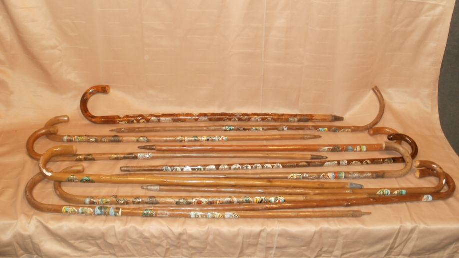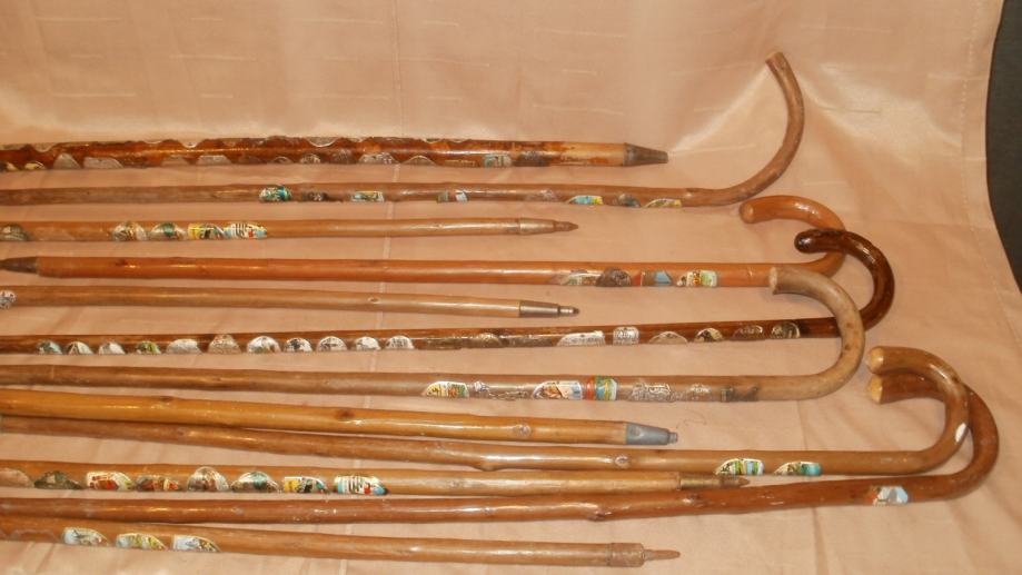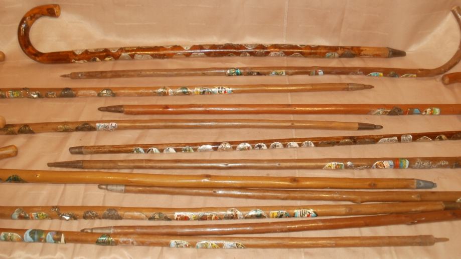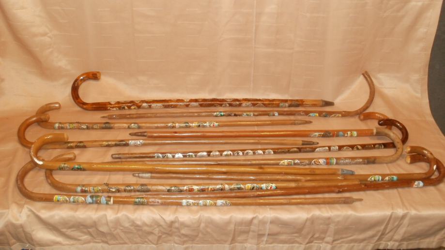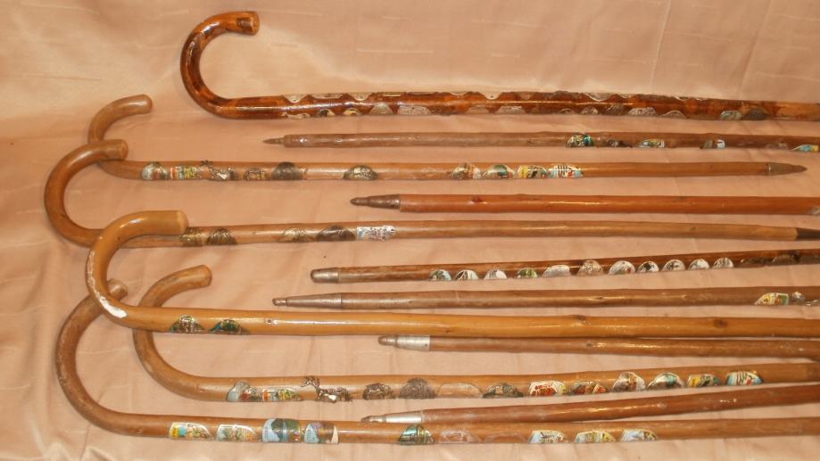 SVIH 16 ZA 160 EURA. STARI DRVENI PLANINARSKI ŠTAPOVI SA OZNAKAMA VRHOVA NA KOJI SU SE NJIHOVI BIVŠI VLASNICI POPELI. NA NEKIMA IMA VIŠE A NA NEKIMA MANJE TIH OZNAKA. NAŽALOST NA NEKIM ŠTAPOVIMA SU OTPALE PAR TIH OZNAKA JER SU BILE SAMO ZALJEPLJENE A NE I PRIKUCANE MALIM ČEVLIĆIMA. SVI IMAJU DOLJE METALNE VRHOVE.
