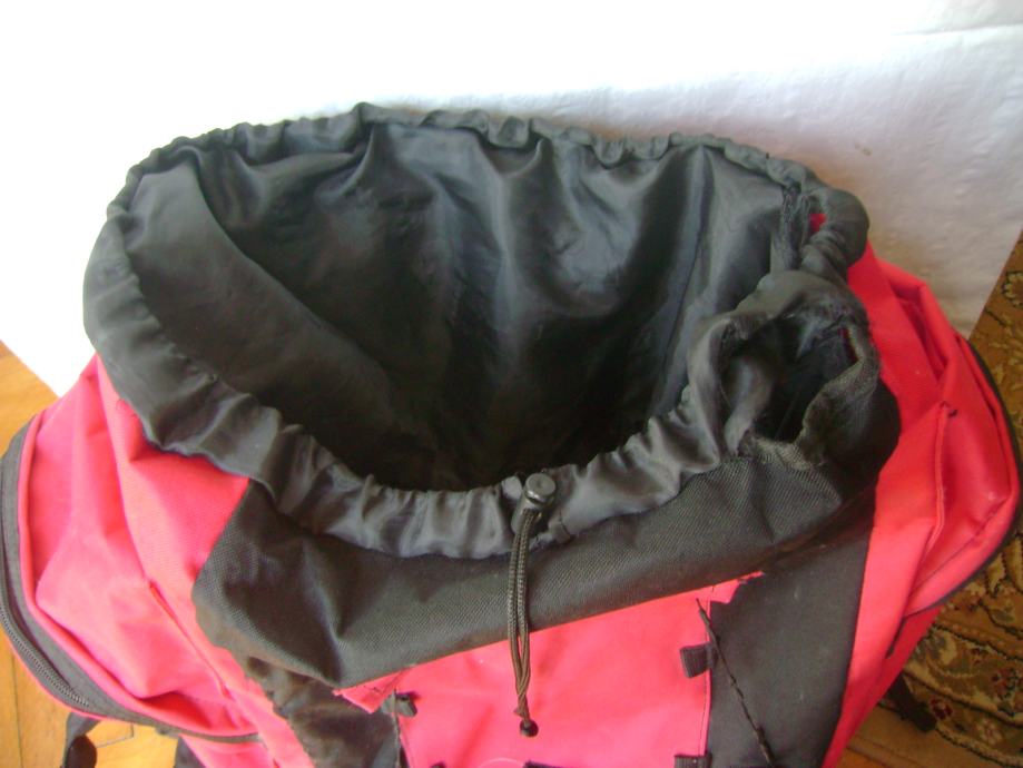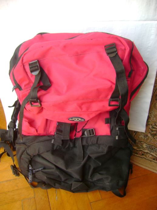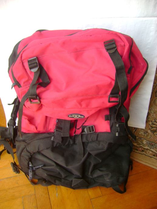 Track & Field - velik i težak ruksak za snažne ljude, ima naramenice i podstavljeni remen oko struka, sa puno džepova, pretinaca i remena za pričvrstiti razne stvari, litražu ne znam, dimenzije su 39 x 24 x 60 cm, svi cifovi i kopče su ispravni, ali je podstava iznutra malo poderano, trebalo bi ju prišiti, zato je i cijena popularna - stanje je vidljivo na slikama..