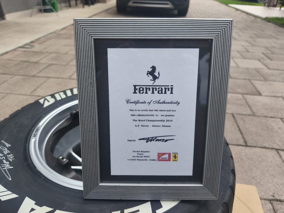 Bbs magnezijska felga i Bridgestone Potenza kisna guma sa potpisom i certifikatom Fernanda Alonsa iz F1 utrke 2010 Korea.