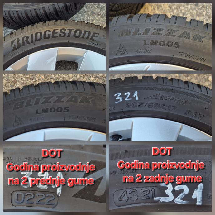 Alu felge 17 5x112 VW Golf 6 7 8 Caddy Touran sa zimskim M+S gumama 205/50R17 93V Bridgestone Blizzak LM005 / na 2 prednje gume dubina sare 7 mm DOT0222 - 2 sedmica 2022 godine / na 2 zadnje gume dubina sare 6.5 mm DOT4321 - 43 sedmica 2021 godine