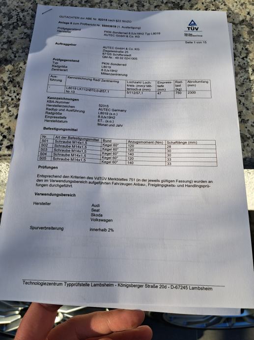 Uz felge dajem distance (2x13 i 2x16 mm) tako da su idealno poravnate sa blatobranom, duze sarafe, prstenove i sve potrebno za ugradnju te TÜV certifikat da se mogu atestirati ako je potrebno.