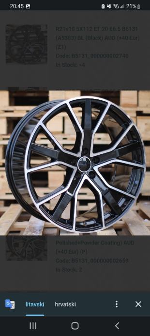 Alu felge 21" 5×112 , 9.5J , ET31 , 66.6 mm centralna. Nove replike Audi model! Kvalitetne felge , garancija 24mj. Cijena za 4 komada je 1400€ , moze i sa novim gumama raznih dimenzija i proizvodaca.