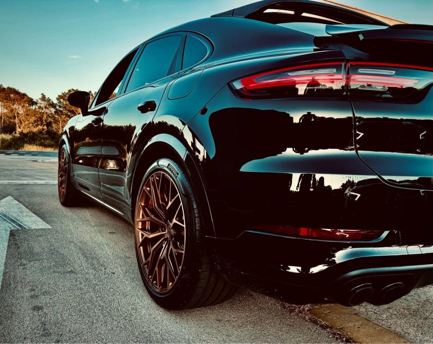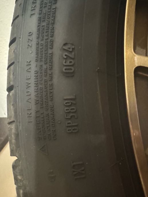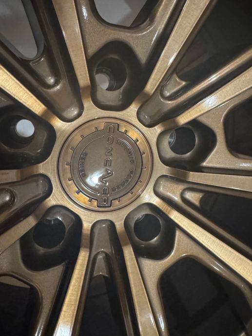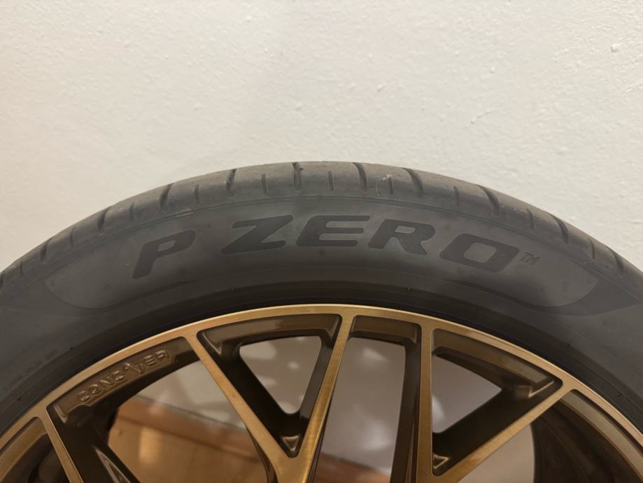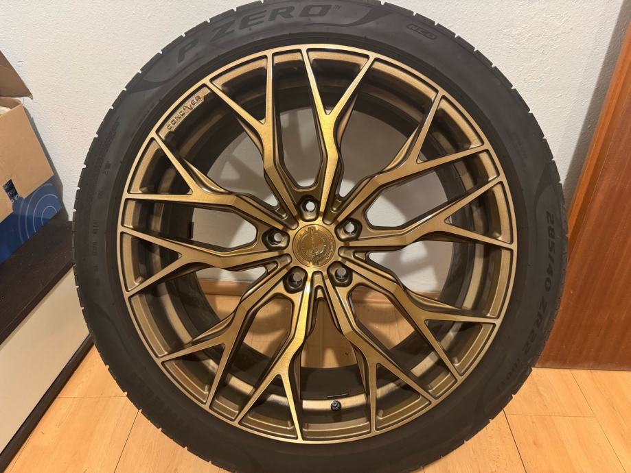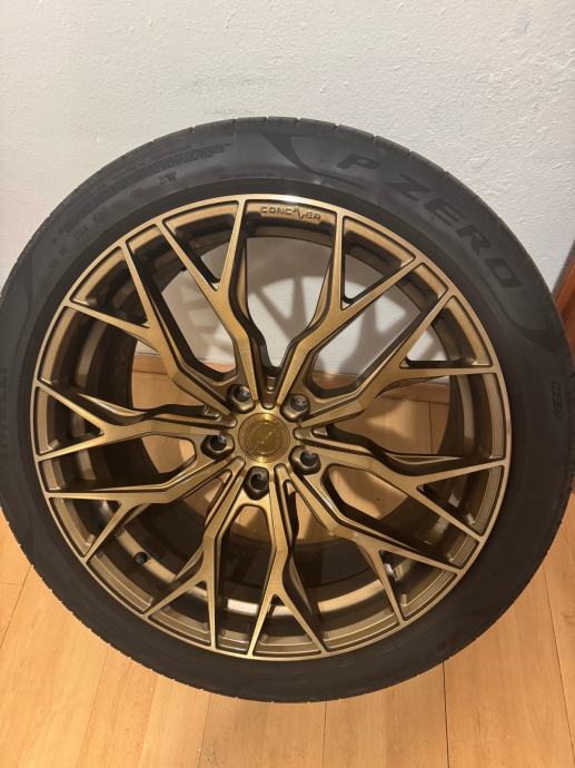 Alu felge (kupljene nove sa gumama) korištene 4 mjeseca, bile na porscheu cayenne, dimenzija guma prednje 285/35/22, zadnje 315/30/22. Gume su Pirelli P zero dot 0624. Felge su model Concaver CVR1, Brushed Bronze