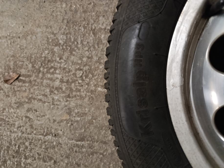 4 felge su na zimskim gumama. Kleber Krisalp HP3, dvije su DOT 21, dvije su DOT 18. Šara super 7mm, nisu ispucale, mogu možda još sezonu poslužiti. Felge su ravne, ispravne, ali djelomično je lak ispucao.