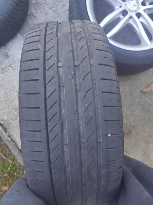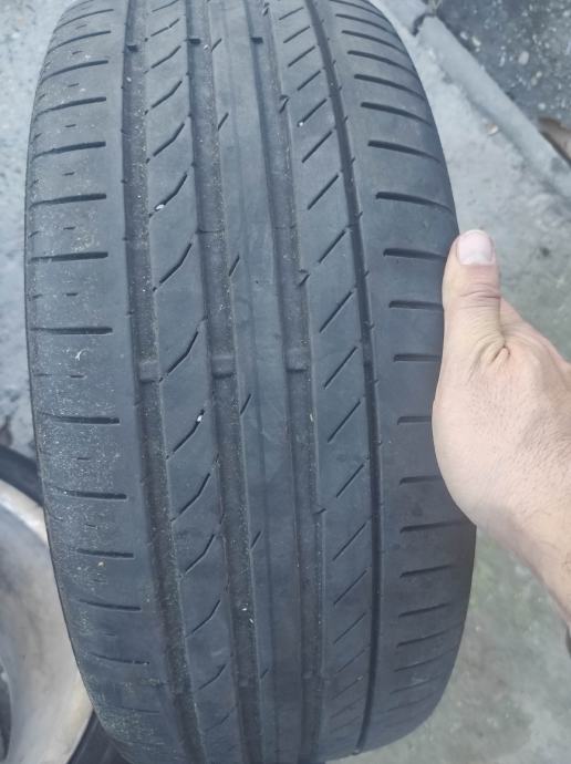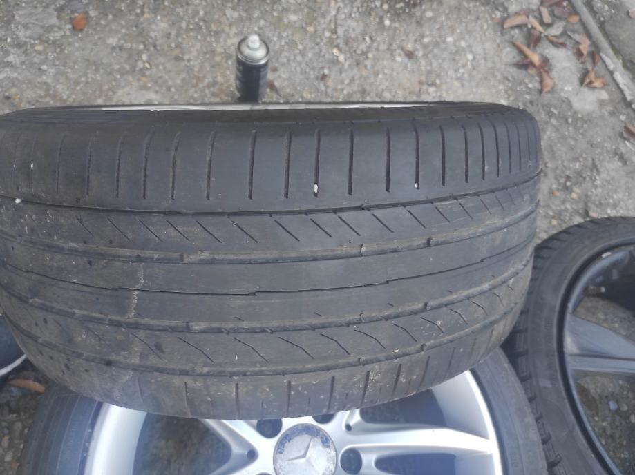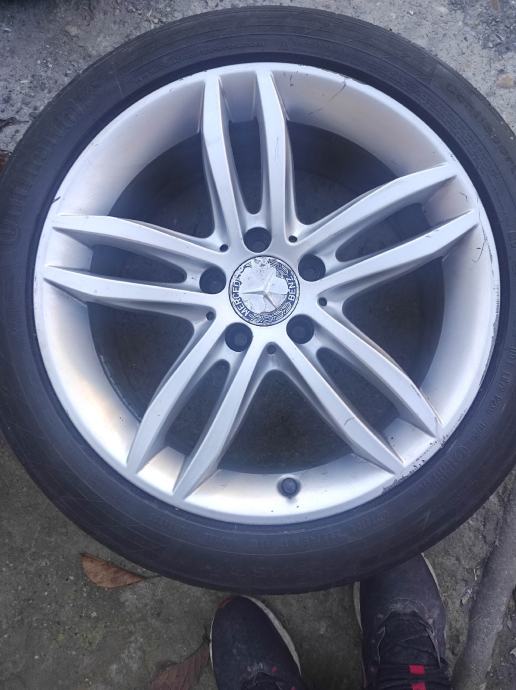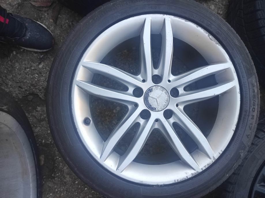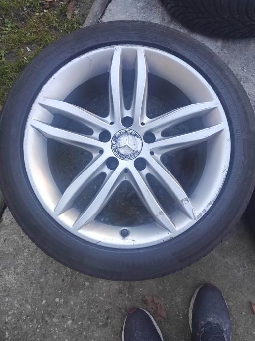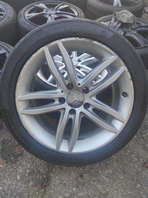 Felge original Mercedes, 17 coli, uže i šire. Prednje su 7.5x17 ET47 s ljetnim gumama Continental 225/45/17, a zadnje su 8.5x17 ET58 s ljetnim gumama Continental 245/40/17. Bile su na c-klasi. Set 300 eura fiksno. Moguca dostava do Zagreba.