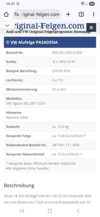 VW Original PASADENA Alu felge 18'' rupe 5x112, 4 kom.