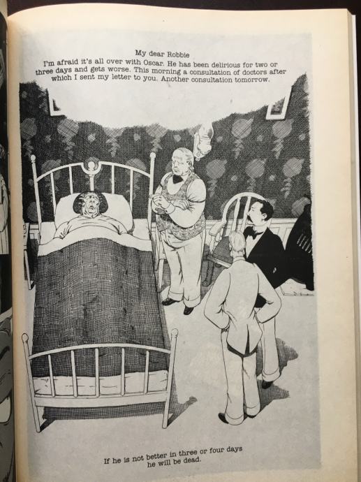 Issues #139–150. This story arc concentrates on the last days and death of Oscar Wilde (who is attended to by his trusted companion Robbie Ross) rather than on Cerebus himself, who appears in only a few pages. (The title refers to the gothic novel Melmoth the Wanderer by Charles Robert Maturin, a relative of Wilde's. Wilde adopted this alias during this period of his life.) Meanwhile, a catatonic Cerebus, believing Jaka to be dead, spends his days mourning on the patio of a café. In the last few pages of the story, after the main action had concluded, Cerebus overhears a conversation by two Cirinist jailers insulting Jaka. Enraged, Cerebus murders one of the guards and then springs into action. More than 11 years into a 25-year project of chronicling the life of a single main character, Dave Sim took a small detour (of sorts), put his main character Cerebus on the sidelines, and told this story of the last days of Oscar Wilde. Some Cerebus readers think this book is a needless distraction from Sim's master epic; others think this is one of Sim's finest achievements, and that by combining and slightly altering the very real letters of Robert Ross to More Adey (originally printed in the Collected Letters of Oscar Wilde), Sim was able to add a depth and breadth to his fiction never before possible. Either way, Sim and exquisite background artist Gerhard are in fine form as they weave this tale of Wilde into their fictional landscape of a new matriarchal establishment.