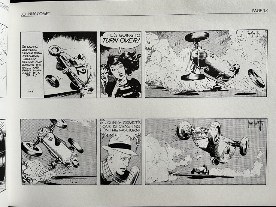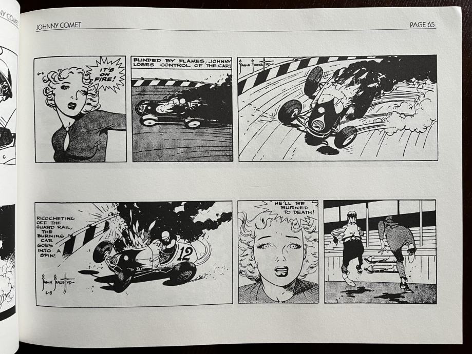 On January 28th,1952, twenty-four-year-old, Frank Frazetta, secured a job working on the action-packed newspaper comic strip, Johnny Comet. Peter De Paolo, a racecar driver who won the Indy 500 in 1925, was credited as the writer while Frank Frazetta was the lead artist. It was told years later that Earl Baldwin was the actual writer behind the strip while De Paolo was more of a technical advisor on the project. Johnny Comet featured Johnny, a debonair racecar driver who had a striking resemblance to Frazetta. The story revolved around California midget-car races and fifty-lap showdowns. Unfortunately, the readership of Johnny Comet remained low throughout the premier year and the syndicate decided to drop the Sunday strip in early 1953. To this day, Frazetta's original Johnny Comet comic strips are highly sought after by collectors due to the superior drawing and inking Frazetta did during this time.