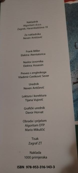 Prodajem strip „Elektra: Atentatorica", prijevod djela „Elektra: assassin", autorski tim Frank Miller i Bill Sienkiewicz, rasprodano izdanje kojeg više nema u prodaji;