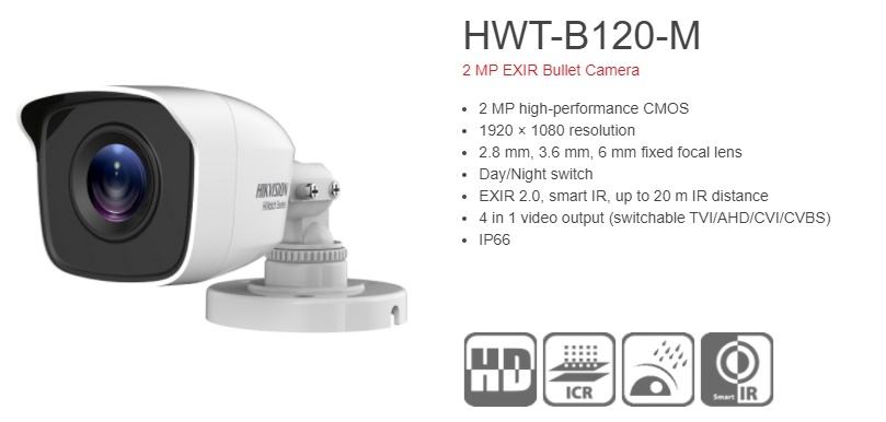 Kamera Bullet Hikvision HiWatch HWT-B120-M , 2MP High perfomance chip. Rezolucija 2 MP . IP 66 za vanjsku i unutarnju ugradnju.