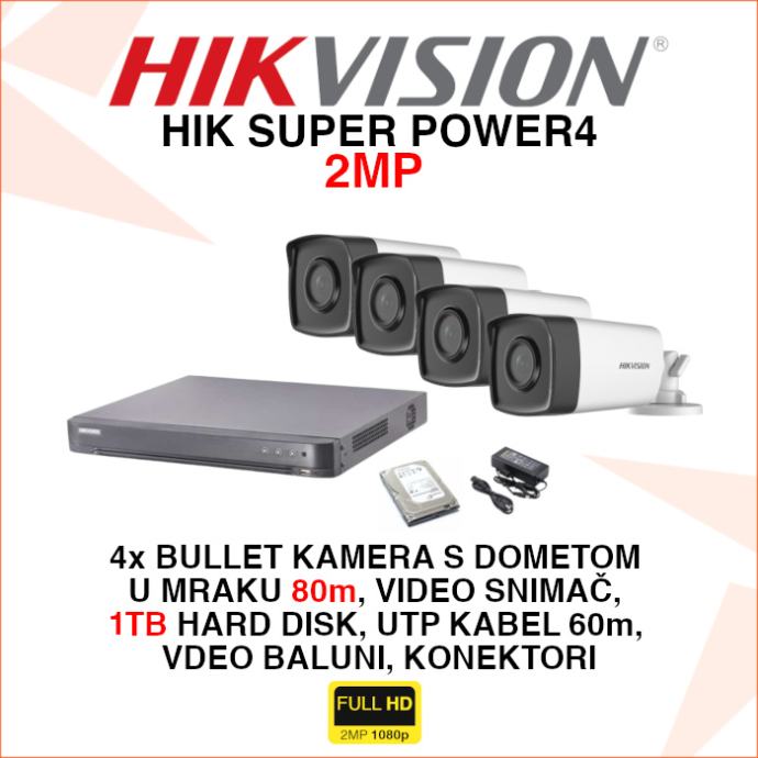 Hikvision set za videonadzor koji u sebi ima 4 bullet kamere (domet u mraku 80m), 4-kanalni digitalni Full HD snimač sa ugrađenim hard diskom, gotovi kabel i adapter.
