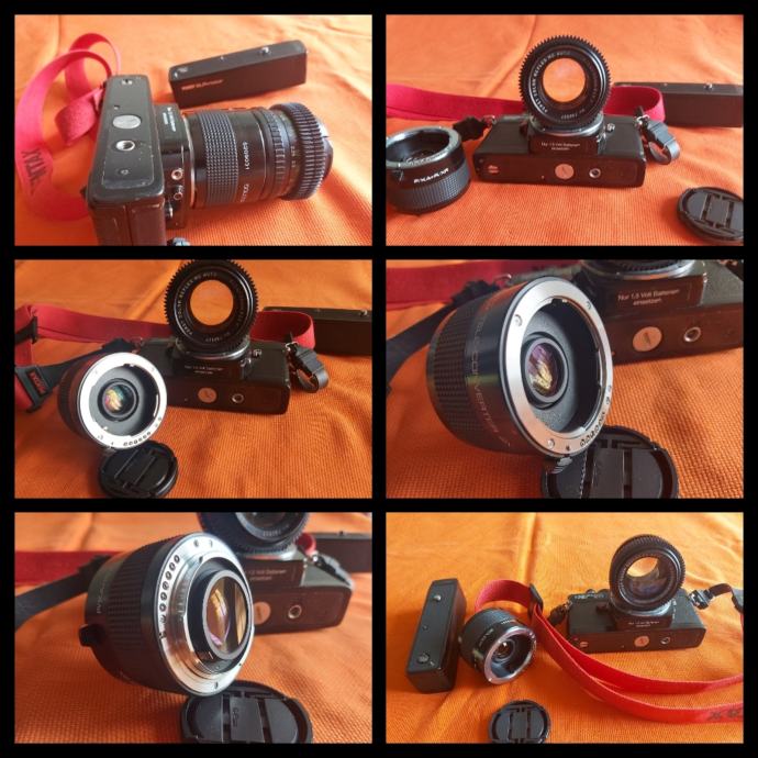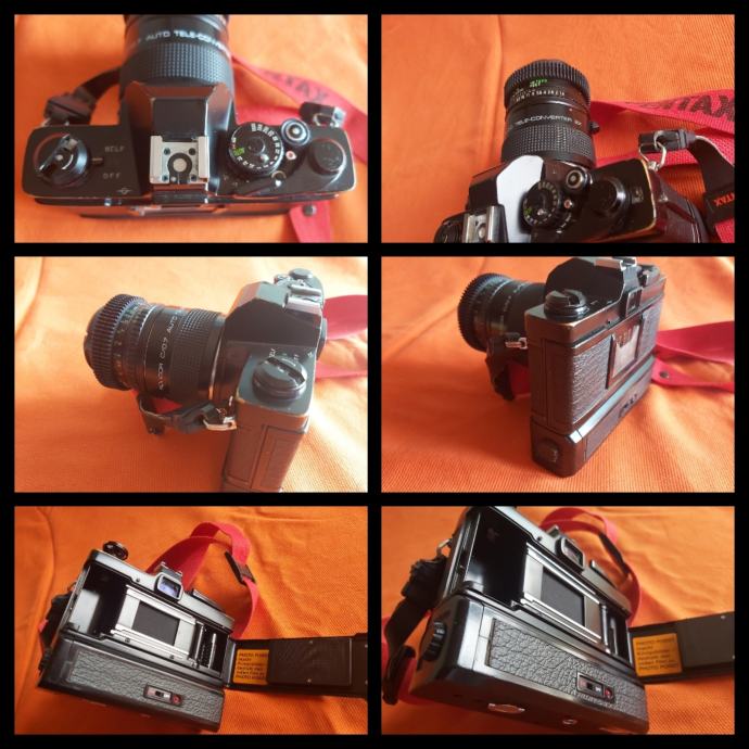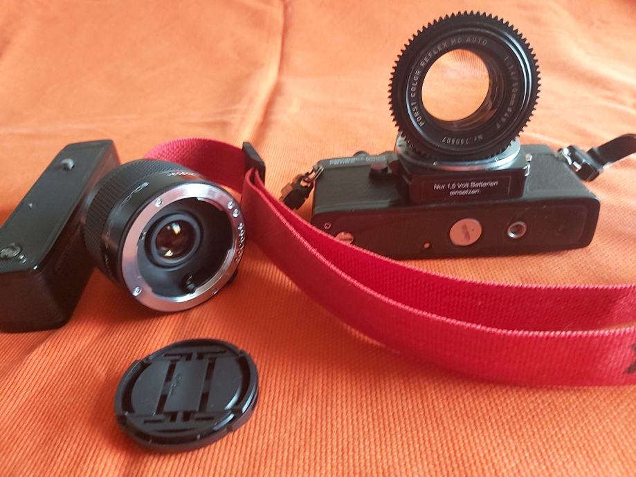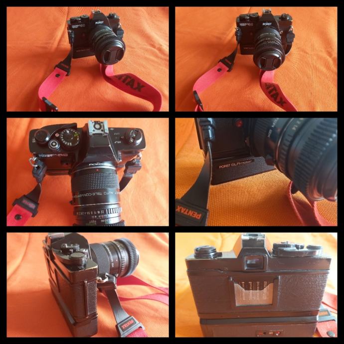 U kompletu POKLANJAM sve ostalo na fotografijama, Porst Compact Reflex OC SLR fotoaparat, soligor 2x telekonverter i battery grip. Filmove nisam razvijao, niti sam koristio SLR fotoaparat, ali koliko vidim radi kako treba, najbrže okidanje 1/1000, najsporije 8 sekundi, apperture priority i shutter priority opcije, shutter okida na svim brzinama, pod/nad ekspozicija radi, svjetlomjer ispravan i točan, informacije u viewfinderu ispravne....