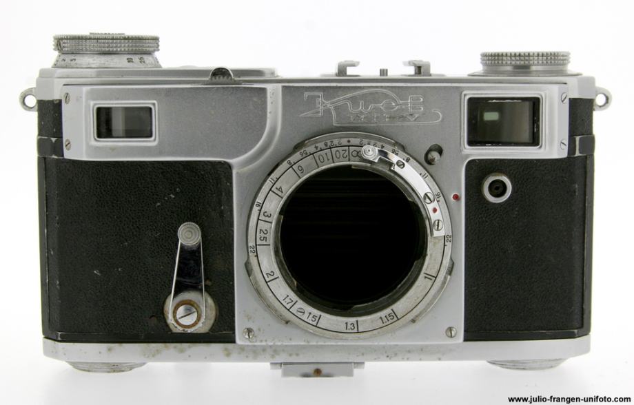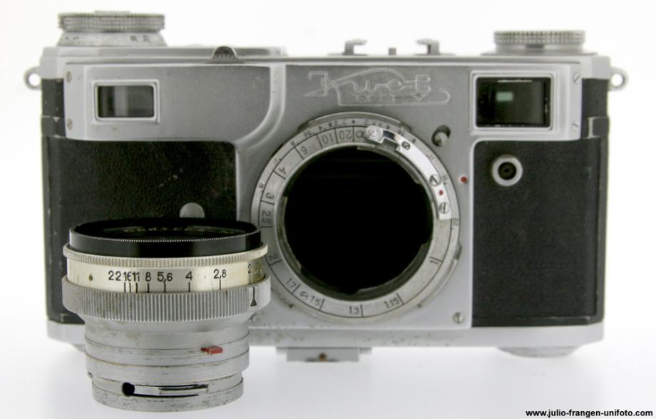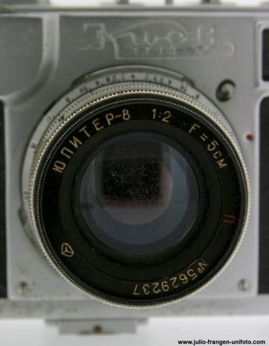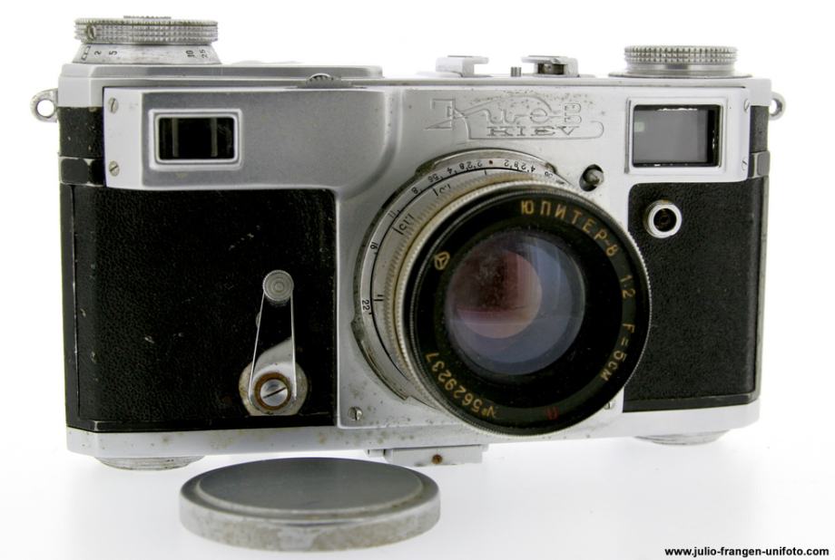 Analogni 35 mm rangefinder fotoaparat KIEV 2A ( kopija CONTAFLEXA ), ruske proizvodnje, tvrtke Arsenal ( Ukrajina ).1956 god. Serijski broj : 5612629. Brzine zatvarača : B, 1 / 25 - 1 / 250 sek. U kompletu dolazi sa objektivom JUPITER 8, 5 cm, 1 : 2 .