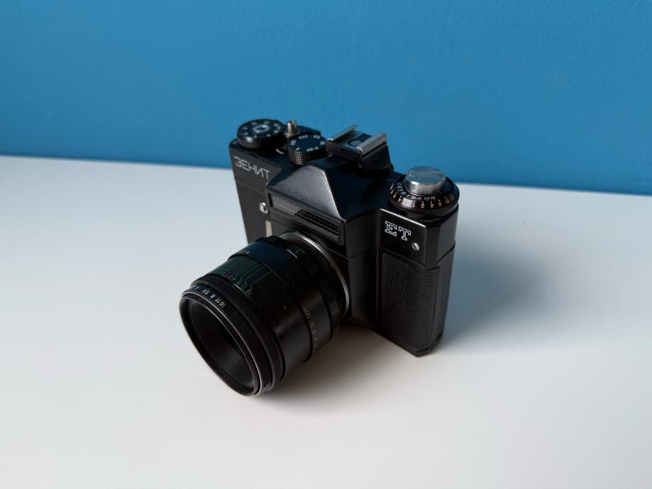 Zenit ET je 35mm SLR sovjetska kamera iz 1980-ih. Dizajnirana je za entuzijaste analogne fotografije, s klasičnim mehaničkim sustavom bez potrebe za baterijama (osim za svjetlomjer). Kamera je opremljena M42 navojem koji omogućuje korištenje širokog spektra objektiva, a trenutno ju prodajem s objektivom Helios-44-2 56mm f/2 Valdaj edition.