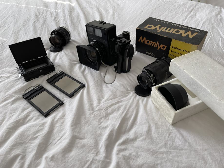 2x backs for sheet film, ideal for using tilt and shift options, though not necessarily required. Along with the sheet film holders, there is a matching holder with a ground glass for direct viewing.
