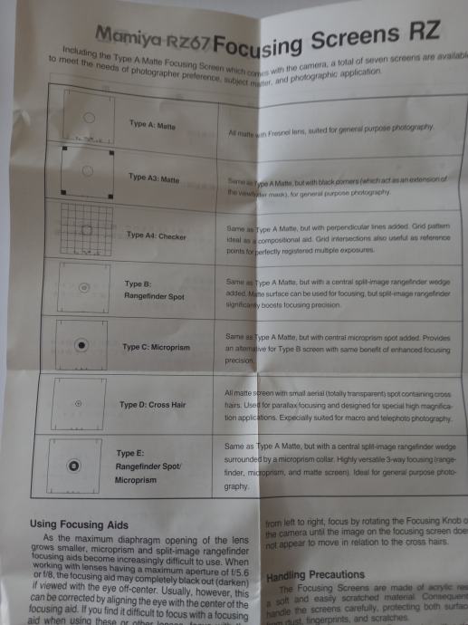 Mamiya RZ67 PRO II Focusing Screen RZ Type A, E, A4