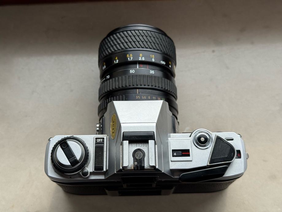 35mm SLR, aperture priority (A) i manualni način rada, brzine 1–1/1000 + Bulb. TTL mjerenje svjetla. Manualni fokus. Raspon 35–70mm (široki kut do portreta).
