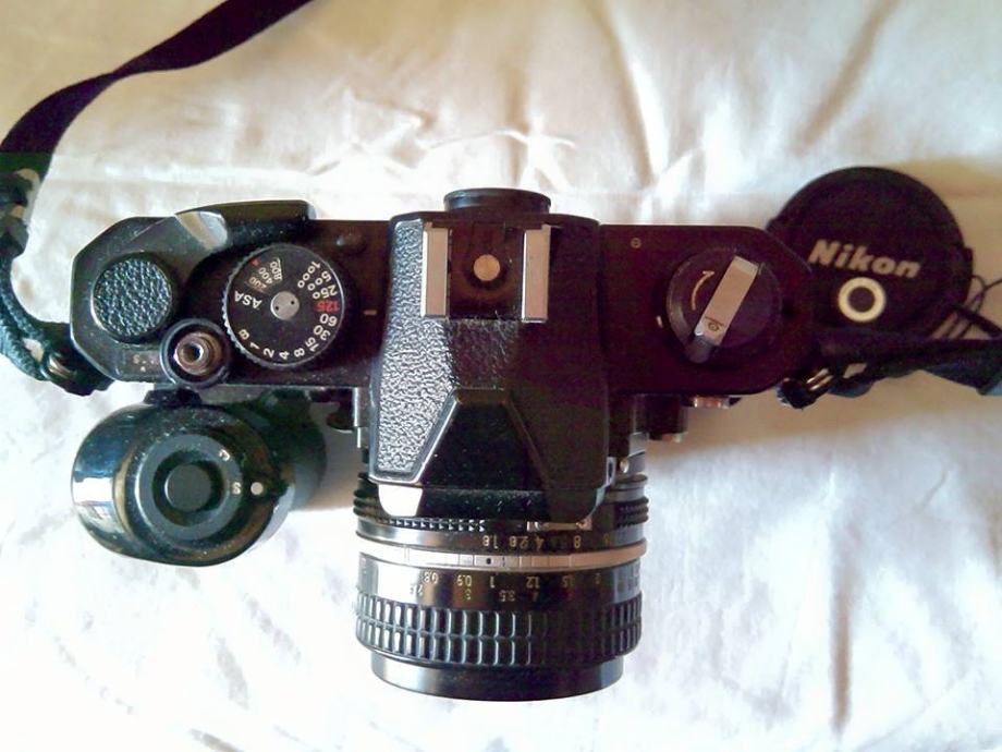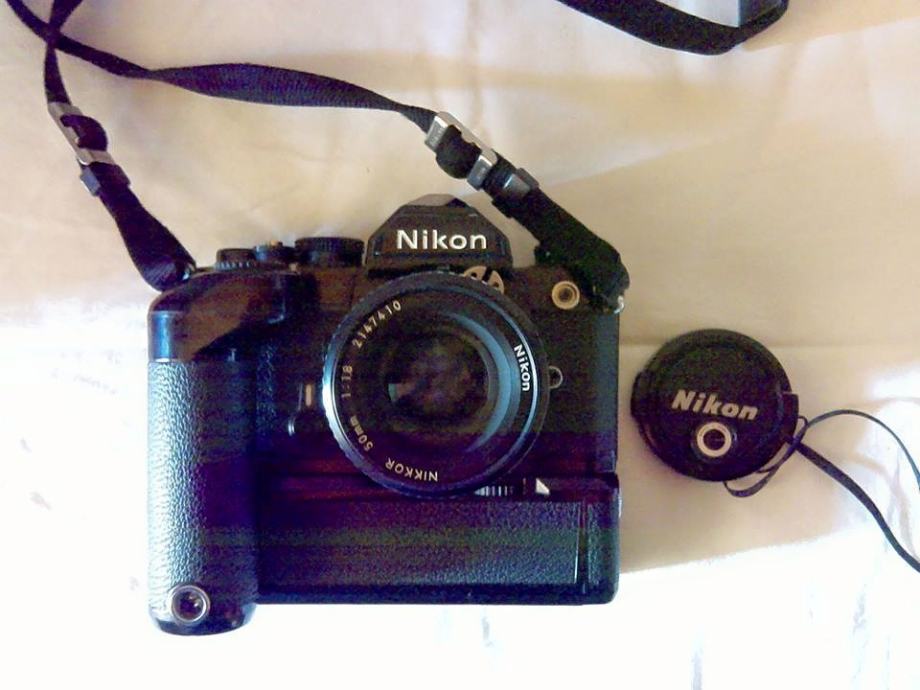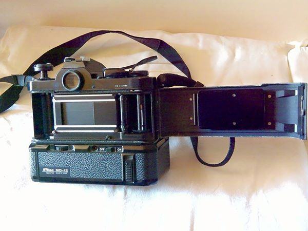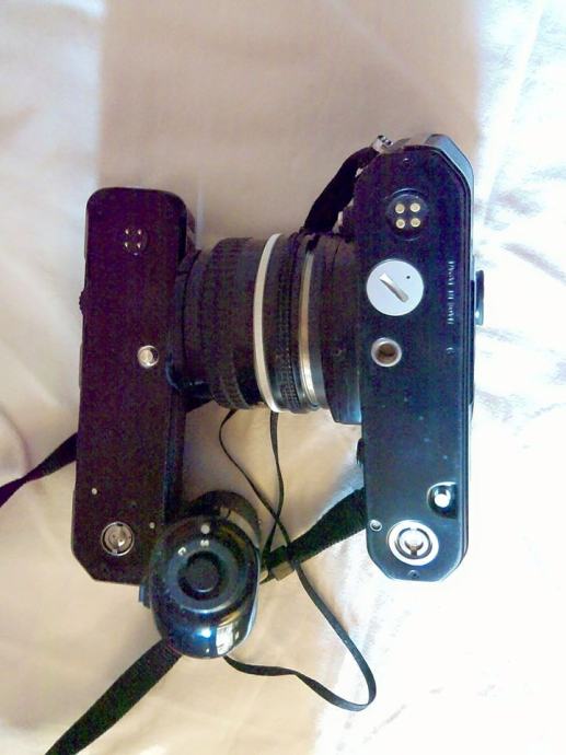 Nikon FM crni s motorom vidi se malo mesinga na ćoškovima ("brassing").