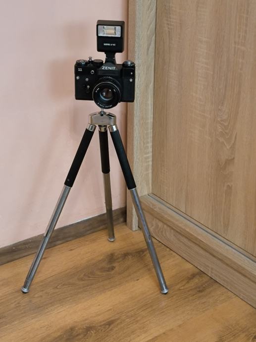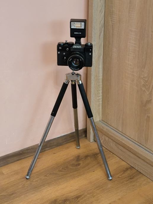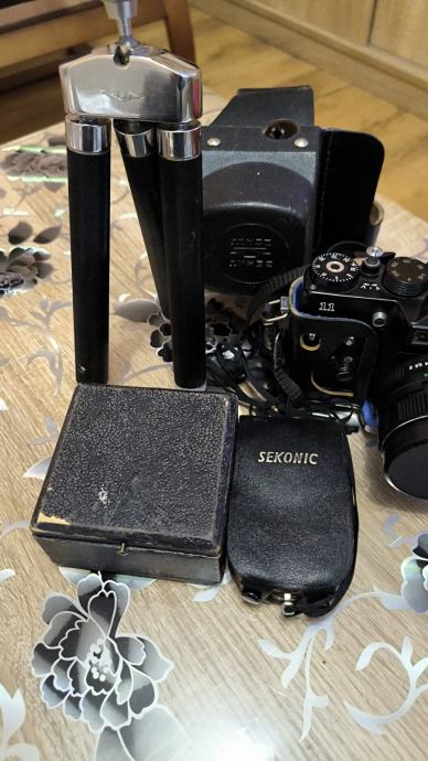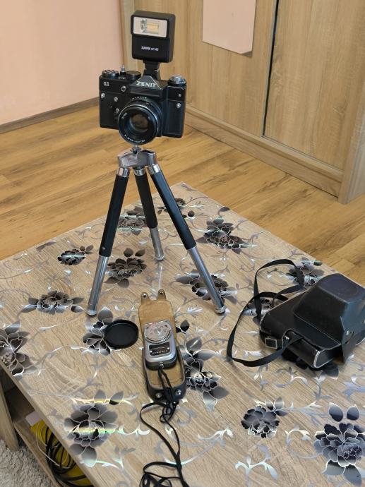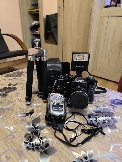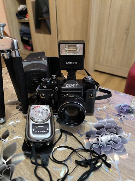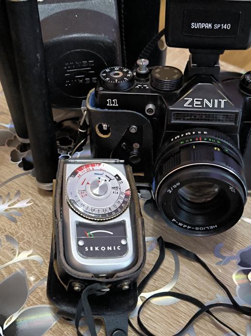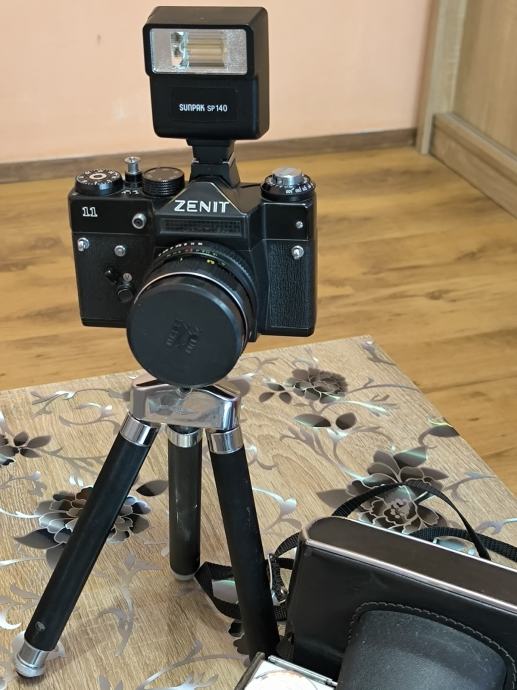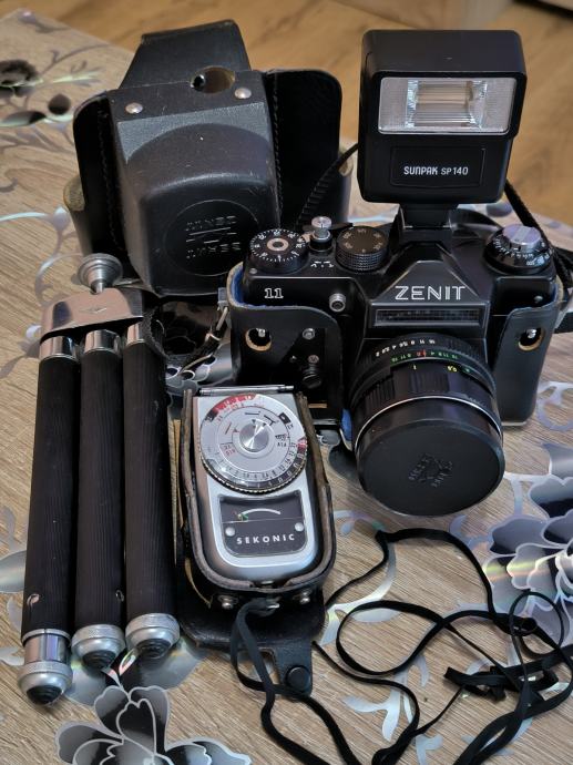 Zenit 11 je analogni 35 mm SLR fotoaparat, proizveden u Sovjetskom savezu .Potpuno je manuelan i najčešće dolazi sa helios 58mm f/2 objektivom . Poznat je po robusnoj izradi , jednostavnom radu i karakterističnom vintage izgledu fotografija. Koristi m 42 navoj za objektive i ima osnovne brzine zatvarača i ugrađen jednostavan svjetlomjer . Popularan je među početnicima i ljubiteljima klasične analogne fotografije. Uz fotoaparat u kompletu ide njegova torbica , stativ ili tronožac koji je jako jako rijedak za naći , njegov blic Sunpak SP 140 , i poseban dodatak mjerač svjetlosti , rijedak mali uređaj koji također ima svoju kožnu futrolicu ,Sve je ispravno i funkcionira vrhunski, fotoaparat nije lupan izgreban ,nema jedne packe na sebi . Dostava i plaćanje sve po dogovoru, 095 576 7704