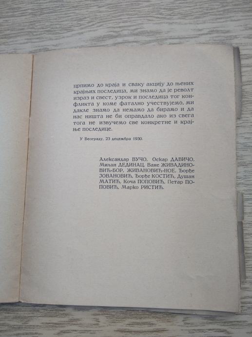 Sa tekstom se složili: Aleksandar Vučo, Oskar davičo, Milan Dedinac, Vane Živadinović-Bor, Živanović - Noe, Đorđe Jovanović, Đorđe Kostić, Dušan Matić, Koča Popović, Petar petrović i marko Ristić. Ima najava da ga je policija zabranila!