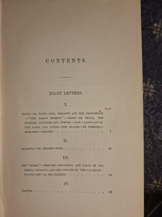 Autor u formi pisama opisuje svoje putovanje preduzeto 1853. godine iz Zagreba, preko Rijeke istočnom jadranskom obalom do Albanije. Pa povratak do Trsta. Daje pregled istorije Dubrovnika do pada Dubrovačke republike. Knjiga sadrži mnogo zanimljivih zapažanja autora o dalmatinskom načinu života. Opisuje Dalmaciju, Dubrovnik, Crnu Goru i Albaniju.