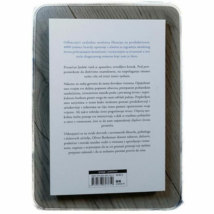 Odbacujući uzaludnu modernu fiksaciju na produktivnost, 4000 tjedana čitatelje upoznaje s alatima za izgradnju smislenog života prihvaćanjem konačnosti i suočavanjem sa stvarnosti u ovo malo dragocjenog vremena koje nam je dano. Prosječan ljudski vijek je apsurdno, uvredljivo kratak. Pod pretpostavkom da doživimo osamdesetu, na raspolaganju imamo nešto više od četiri tisuće tjedana. Nikome ne treba govoriti da nema dovoljno vremena. Opsjednuti smo svojim sve duljim popisom obaveza, pretrpanim poštanskim sandučićima, ravnotežom između posla i privatnog života i neprekidnom borbom protiv svega što nam odvlači pažnju. Preplavljeni smo savjetima o tome kako možemo postati produktivniji i učinkovitiji i trikovima uz čiju ćemo pomoć optimizirati svoje vrijeme. Ali takve tehnike često pogoršavaju stvari. Osjećaj tjeskobne žurbe postaje sve intenzivniji, a dok se trudimo pobijediti u utrci s vremenom, čini se da nam najsmisleniji dijelovi života promiču. Oslanjajući se na uvide drevnih i suvremenih filozofa, psihologa i duhovnih učitelja, Oliver Burkeman donosi zabavan, duhovit, praktičan i istinski smislen vodič o vremenu i upravljanju vremenom, napisan s uvjerenjem da su svi poznati pristupi toj vještini potpuno zakazali i da se trebamo prestati praviti da nisu.