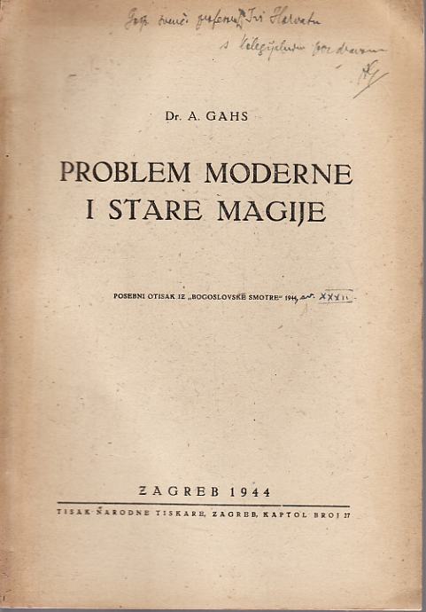 A. GAHS : PROBLEM MODERNE I STARE MAGIJE , ZAGREB 1944 - posveta autor