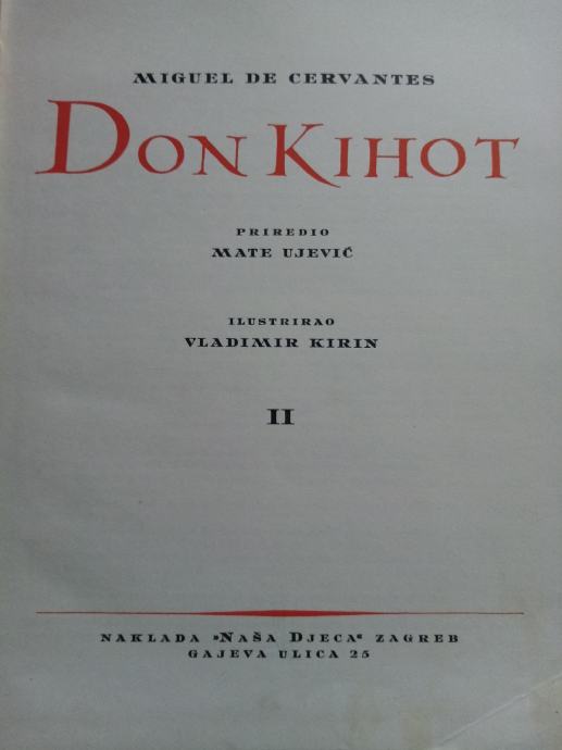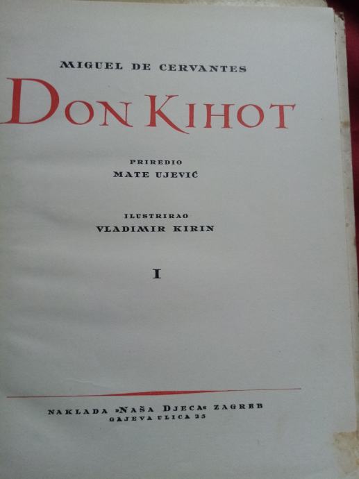 Don Kihot, priredio M. Ujević, ilustrirao V. Kirin, jubilarno izdanje povodom 10 - godišnjice izdavačke djelatnosti naklade "Naša djeca", u dva dijela. Cijena za obe knjige je 15 € .