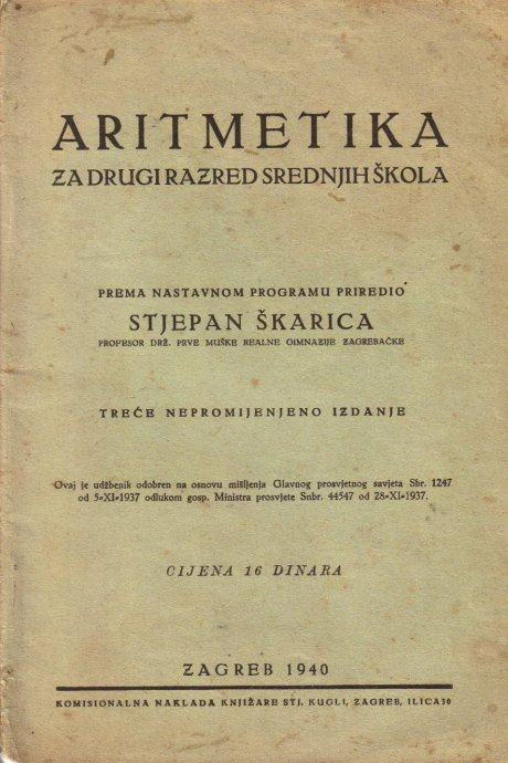 Udžbenik 'Aritmetika za 2. razred srednjih škola' Stjepana Škarice iz 1940.