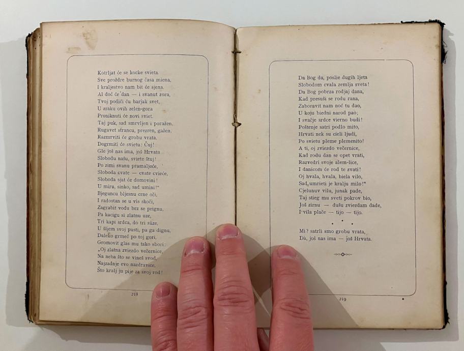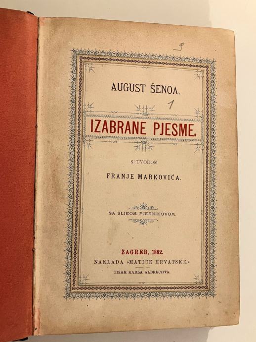 August Šenoa ( Zagreb, 1838. – Zagreb, 1881.) Pripovjedač, pjesnik, feljtonist i kritičar. Najveće ime hrvatske književnosti 19. stoljeća. Izabrane pjesme, prvo izdanje iz 1882. sa slikom pjesnikovom. Uvod je napisao Franjo Marković. Tisak Karla Albrechta.