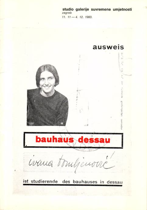 Uz katalog dolazi i pozivnica za izložbu Ivane Meller Tomljenović Bauhaus Dessau 1929-1930 koja je održana 12.02.1987. u Cankarjevom domu u Ljubljani.