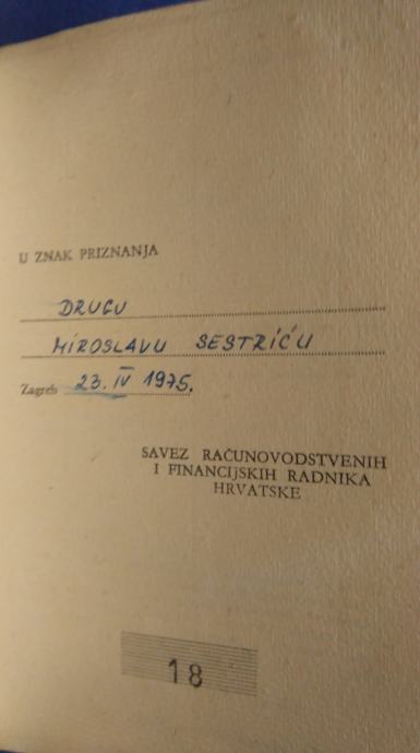 DODATAK (OSOBNA POSVETA) - U ZNAK PRIZNANJA DRUGU MIROSLAVU SESTRIĆU - 23. IV. 1975 - SAVEZ RAČUNOVODSTVENIH I FINANCIJSKIH RADNIKA HRVATSKE