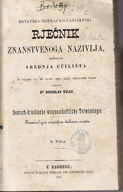 BOGOSLAV ŠULEK : HRVATSKO NJEM. TALIJAN. RJEČNIK ZNANSTVENOGA NAZIVLJA