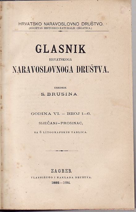 2.S. BRUSINA : GLASNIK HRV. NARAVOSLOVBOGA DRUŽTVA 1892 - 1894. , 312 STR + VI LITOGRAFIČKIH TABLICA