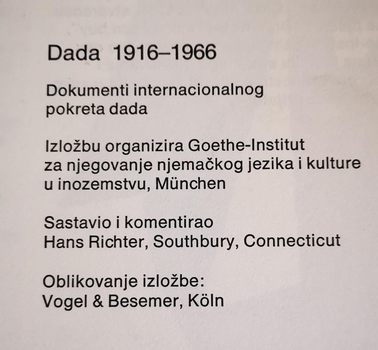Dada 1916-1966 – Dokumenti internacionalnog pokreta Dada katalog. Goethe-Institut za njegovanje njemačkoj jezika i kulture u inozemstvu, Munchen, 1971. 104 str., meki uvez s klapnama, 21 x 22 cm.