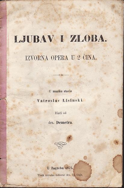 DEMETER LISINSKI: LJUBAV I ZLOBA IZVORNA OPERA U 2 ČINA, ZAGREB 1873