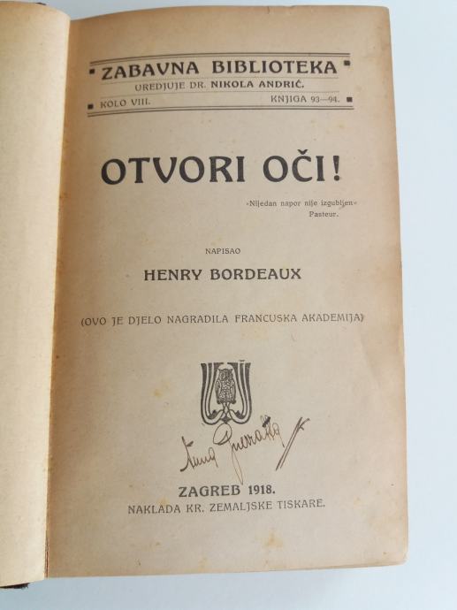 Antikvitet DR. NIKOLA ANDRIĆ. 1918 OTVORI OČI HENRY BORDEAUX 1918