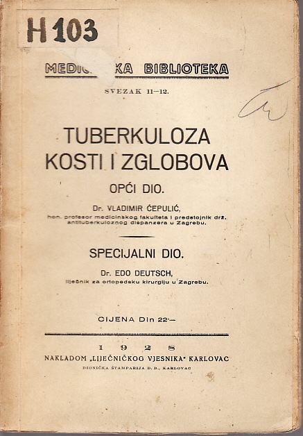 2. TUBERKULOZA KOSTI I ZGLOBOVA - Opći dio - Dr. Vladimir Ćepulić , Specijalni dio - Dr. Edo Deutsch , KARLOVAC 1928. 95 STR.