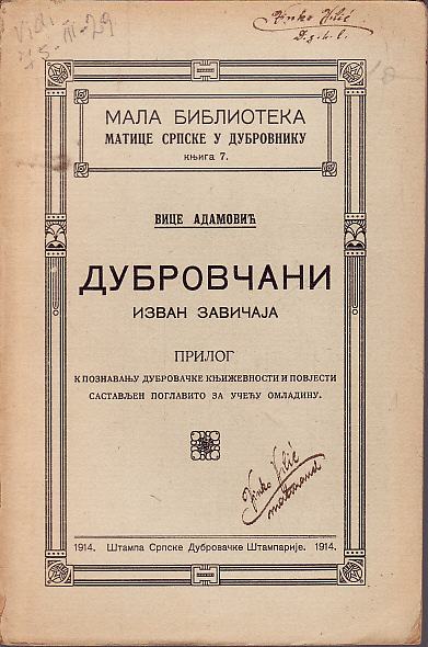 7. VICE ADAMOVIĆ : DUBROVČANI IZVAN ZAVIČAJA , DUBROVNIK 1914. MEKI UVEZ , 20 CM , 32 STR...................100 KUNA