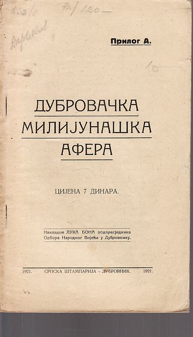 3. DUBROVAČKA MILIJUNAŠKA AFERA , DUBROVNIK 1921. MEKI UVEZ , 22 CM , 102 STR....................120 KUNA